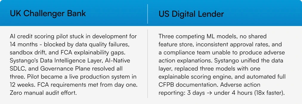 - Regulatory Explainability: CFPB adverse action notices and FCA Consumer Duty both require specific, traceable decision rationales. Credit scoring models not built with explainability cannot produce these retroactively, creating immediate enforcement exposure.