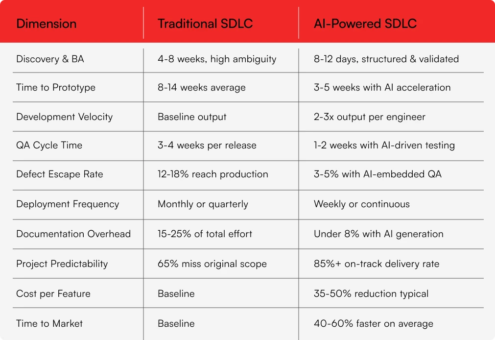 The most useful frame for understanding AI’s commercial impact on SDLC is a direct, honest comparison between what traditional software delivery costs – in money, time, risk, and opportunity – and what AI-powered delivery costs. Below is that comparison, drawn from Systango’s delivery data and independently published research.