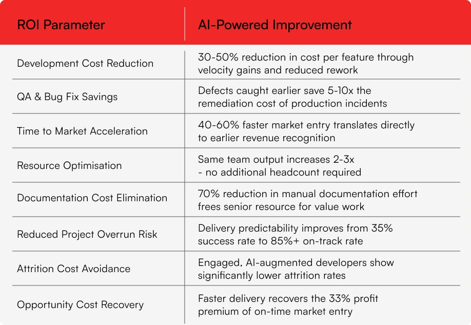 Return on investment in AI-powered SDLC operates across multiple dimensions simultaneously. Unlike most technology investments where benefit accrues in a single area, AI delivers compounding returns across cost, speed, quality, and risk – all at the same time.