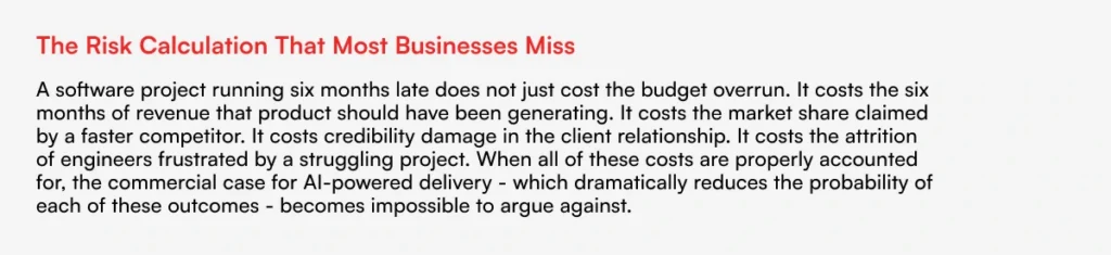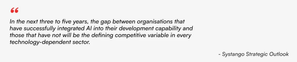 This velocity advantage is self-reinforcing. The organisations building AI-powered development capability now are not just moving faster today – they are accumulating the institutional knowledge, tooling maturity, and delivery process sophistication that will keep them ahead of competitors who delay this transition.