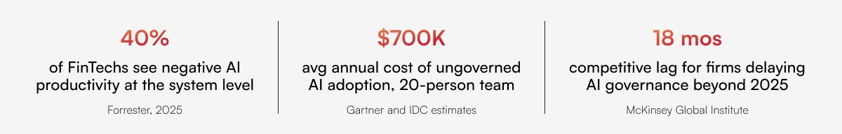 Here is a number your board needs to see: 40% of financial services firms that adopted AI tools in 2023–24 are now shipping products more slowly than before, according to Forrester research. Not the same speed. Slower. And the gap between AI-governed firms and ungoverned ones is compounding every quarter.