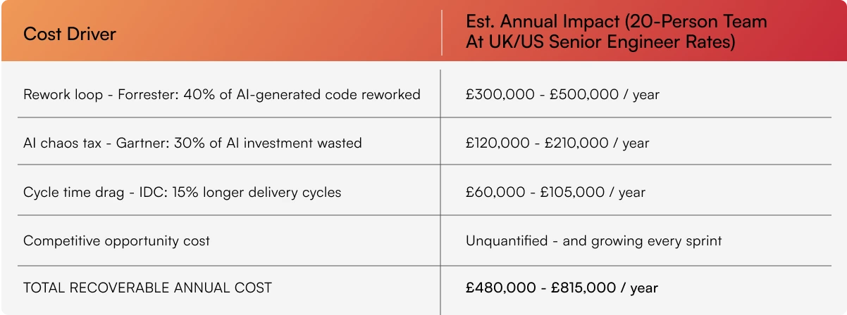 Action 3 – Ask your most senior engineer for your current PR merge time. More than two days a review bottleneck that structured AI governance can cut by 40–60%. Multiply by sprint velocity and annual engineering cost – that is your recoverable AI chaos tax.