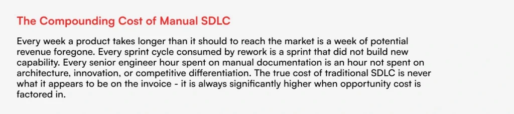 Beyond the visible metrics of time and money, traditional SDLC carries a hidden cost that is harder to quantify but equally damaging: the opportunity cost of slowness.
