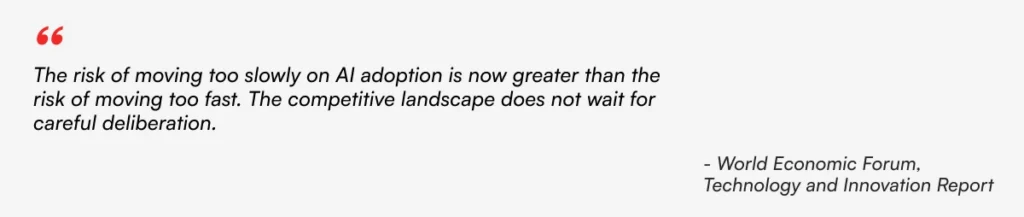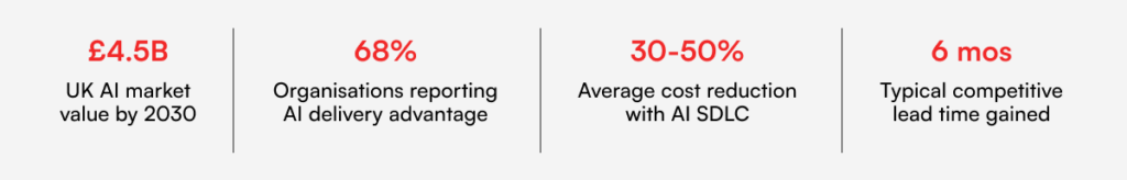 This velocity advantage is self-reinforcing. The organisations building AI-powered development capability now are not just moving faster today – they are accumulating the institutional knowledge, tooling maturity, and delivery process sophistication that will keep them ahead of competitors who delay this transition.