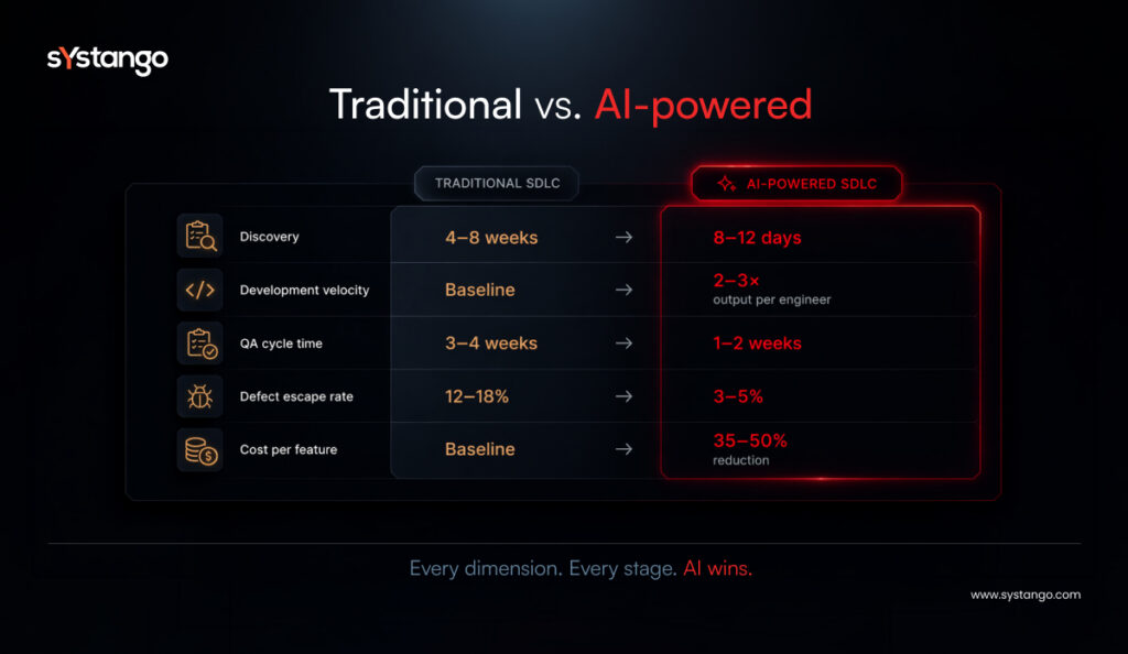 The most useful frame for understanding AI’s commercial impact on SDLC is a direct, honest comparison between what traditional software delivery costs – in money, time, risk, and opportunity – and what AI-powered delivery costs. Below is that comparison, drawn from Systango’s delivery data and independently published research.