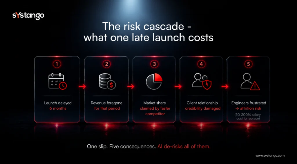 AI reduces risk systematically rather than incidentally. Automated requirements validation reduces requirements risk. AI-powered code review and continuous security scanning reduce technical risk. Predictive project analytics reduce delivery risk. At Systango, we have seen the cumulative effect of these risk reductions transform client confidence in our delivery commitments – and our ability to make those commitments with genuine certainty.