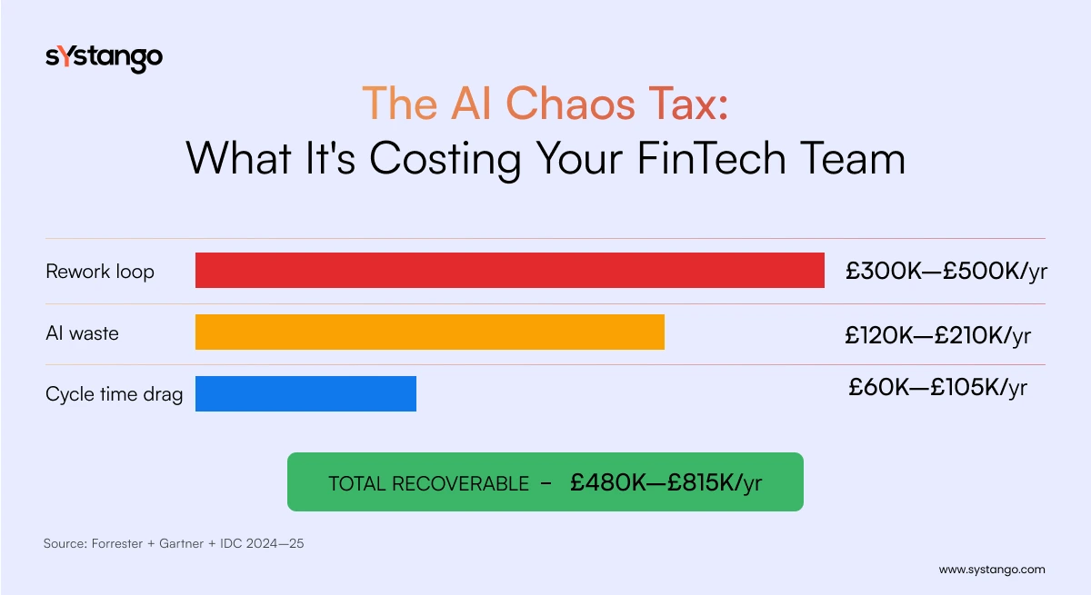 AI coding tools are trained on general-purpose codebases. FinTech systems run on jurisdiction-specific currency rounding rules, PCI DSS scope boundaries, and fraud detection logic that must hold under adversarial inputs. Forrester research found that in organisations without AI governance frameworks, approximately 40% of AI-generated code requires significant rework before it meets production standards – costing a 20-person team an estimated £300,000–£500,000 annually.
