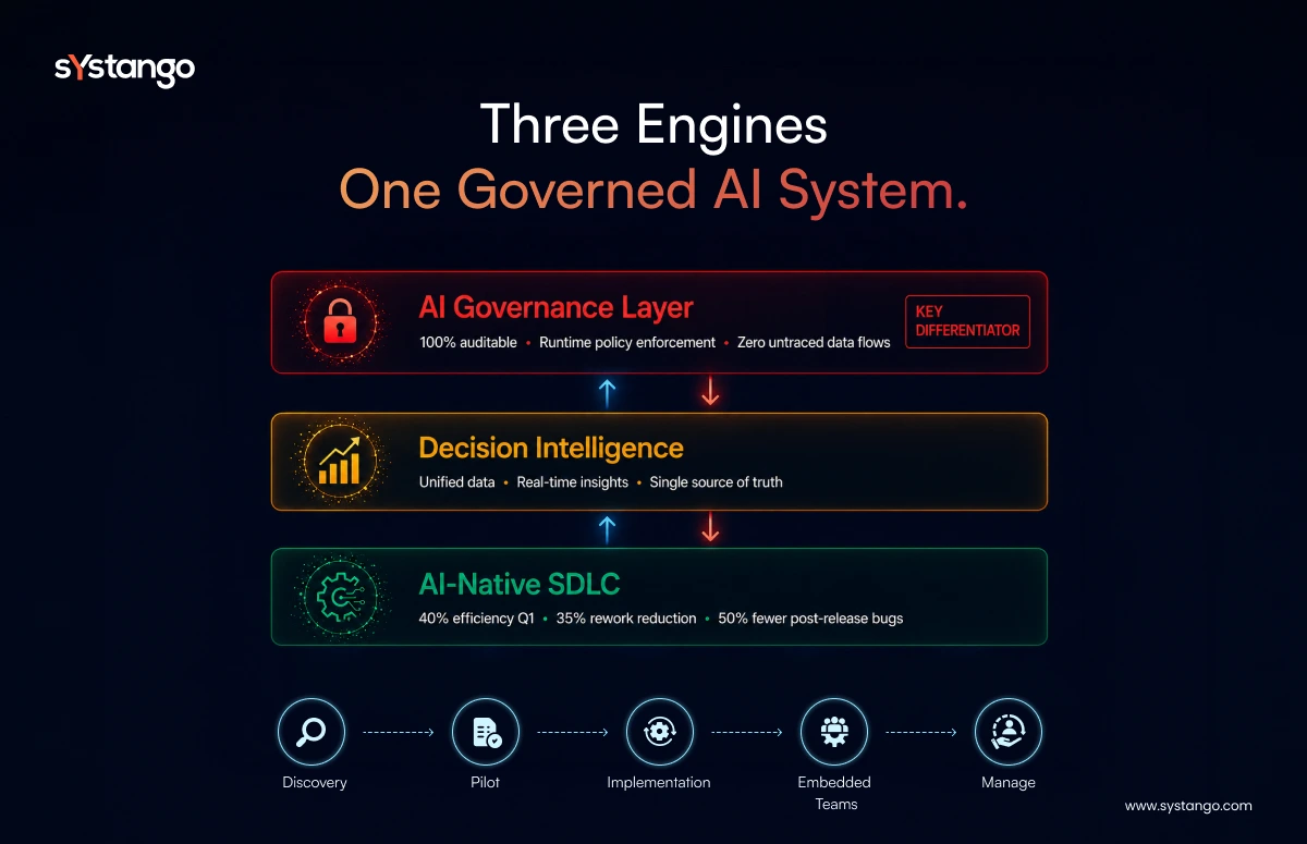 Beyond engineering: faster sprint cycles mean new products reach customers 30–50% faster than ungoverned AI teams, as McKinsey’s analysis indicates. Built-in audit trails reduce FCA / OCC review cycle time by up to 40%. Systango clients demonstrate board-level AI ROI within 90 days of AI Workbench deployment.