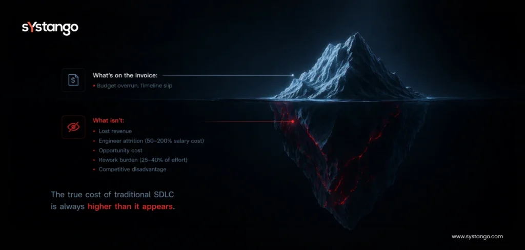 Beyond the visible metrics of time and money, traditional SDLC carries a hidden cost that is harder to quantify but equally damaging: the opportunity cost of slowness.